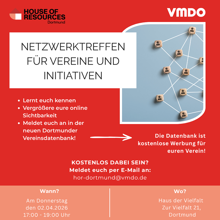 Wir fördern das zivilgesellschaftliche Engagement von Migrant*innen, sind Träger vielfältiger sozialer und kultureller Projekte und verstehen uns als Stimme der Migrant*innen in Dortmund.