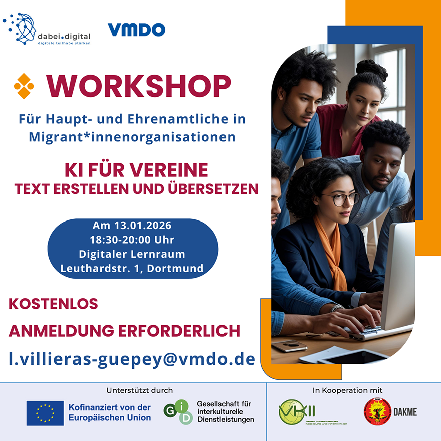 Entdecke, wie dir Künstliche Intelligenz die Vereinsarbeit erleichtern kann! In diesem Workshop lernst du, mit einfachen KI-Tools schnell Texte zu erstellen und Inhalte in verschiedene Sprachen zu übersetzen. Praktisch, unkompliziert und perfekt für Migrantenorganisationen, die ihre Kommunikation aufs nächste Level bringen wollen.